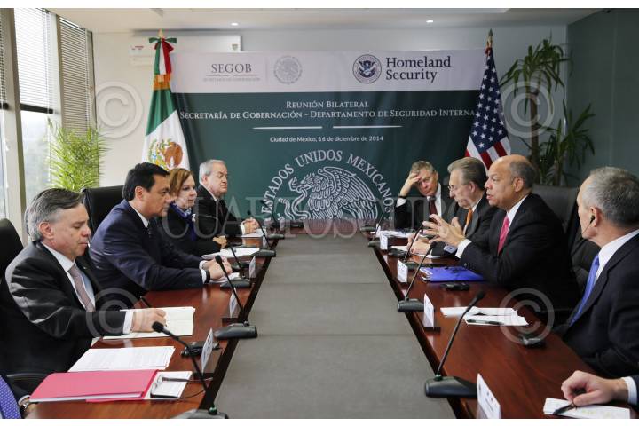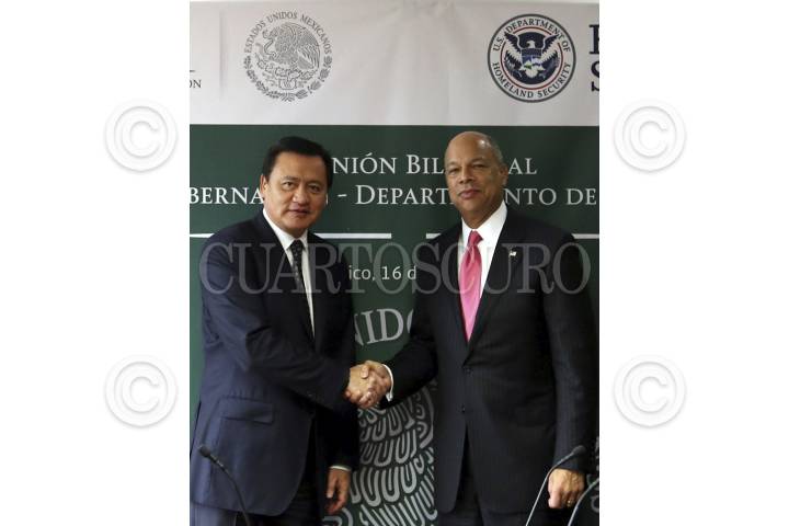 MÉXICO, D.F., 16DICIEMBRE2014.- Miguel Ángel Osorio Chong, secretario de Gobernación, y Jeh Johnson, secretario del Departamento de Seguridad Interna de Estados Unidos, sostuvieron hoy una reunión en la que reconocieron que el actual es uno de los mejores momentos en la historia de la relación México-Estados Unidos. Además, destacaron la colaboración existente para encontrar soluciones a los problemas comunes. FOTO: CUARTOSCURO.COM