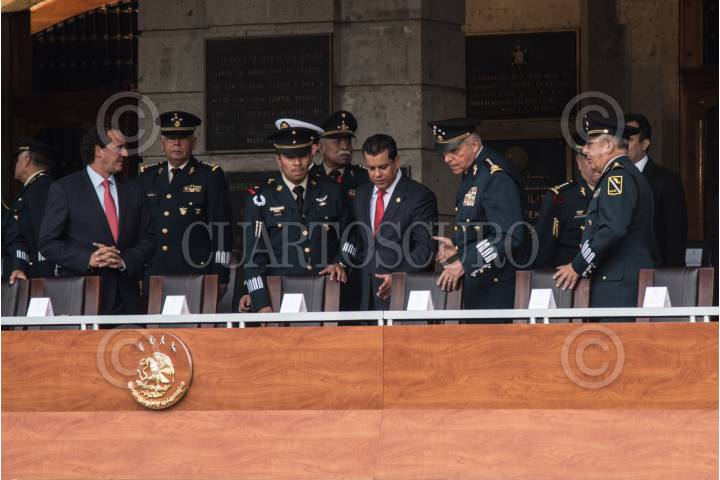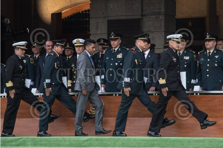 CIUDAD DE MÉXICO, 09AGOSTO2018.- Salvador Cienfuegos Zepeda, secretario de la Defensa Nacional; Vidal Soberón Sanz, secretario de Marina; y Alberto Elías Beltrán, subprocurador Jurídico y de Asuntos Internacionales y encargado de despacho de la PGR, encabezaron la “Ceremonia de Graduación de la 37/a. Antigüedad de la Maestría en Administración Militar para la Seguridad Interior y Defensa Nacional” llevada a cabo en el campo militar número 1-B, en Popotla. FOTO: MARIO JASSO /CUARTOSCURO.COM