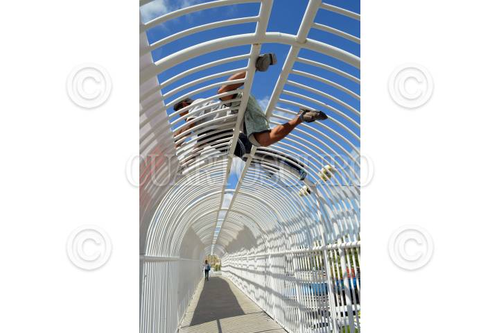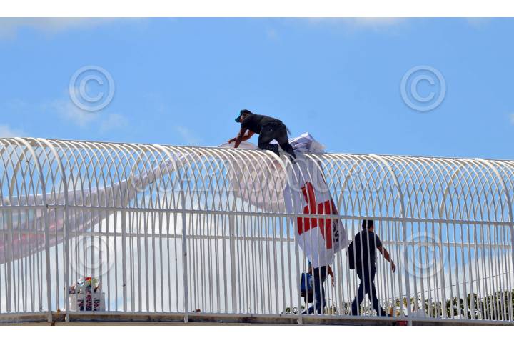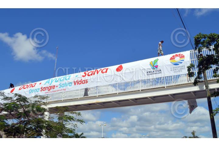CANCUN, QUINTANA ROO, 29FEBRERO2016.- Trabajadores contratados por una empresa privada que es arrendada por el ayuntamiento de Cancun, trabajan colocando mantas de publicidad sin ningún tipo de seguridad. FOTOS: ELIZABETH RUIZ /CUARTOSCURO.COM