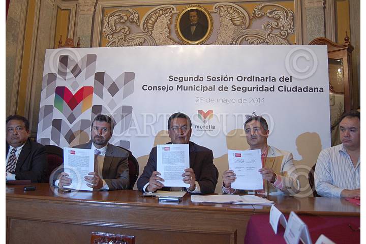 MORELIA, MICHOACÁN, 27MAYO2014.- Ayer por la noche, el Ayuntamiento de Morelia firmó el acuerdo que contiene lo estipulado para la conformación del Mando Unificado Policial, durante la segunda sesión ordinaria del Consejo Municipal de Seguridad Ciudadana. FOTO: JUAN JOSÉ ESTRADA SERAFÍN /CUARTOSCURO.COM