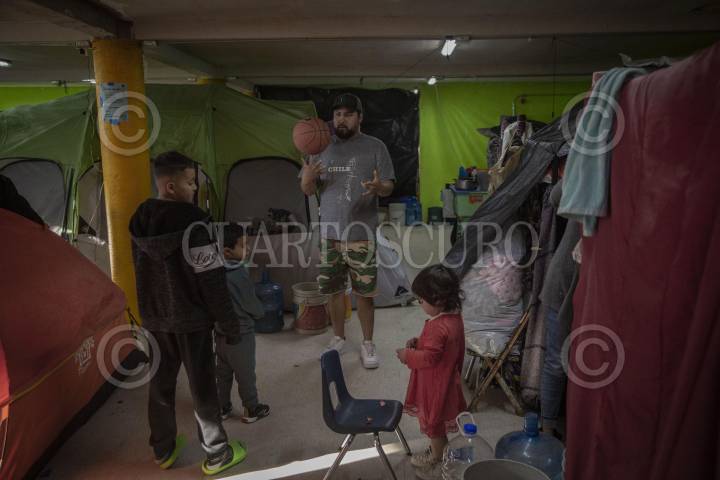 Niños en albergue Agape jugando con pelota de básquetbol.