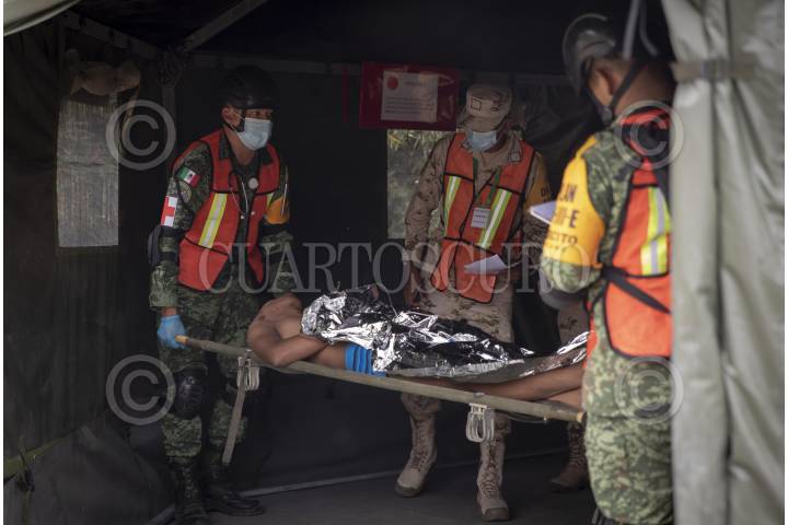Paramédicos del Ejército Mexicano simulando haciendo atenciones medicas.