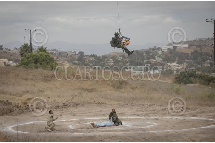 Elementos del Ejército Mexicano, realizando simulación de atención medica a lesionados.