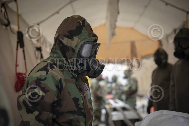Agente del ejército mexicano con mascarilla de seguridad en simulación de derrame de sustancias químicas.
