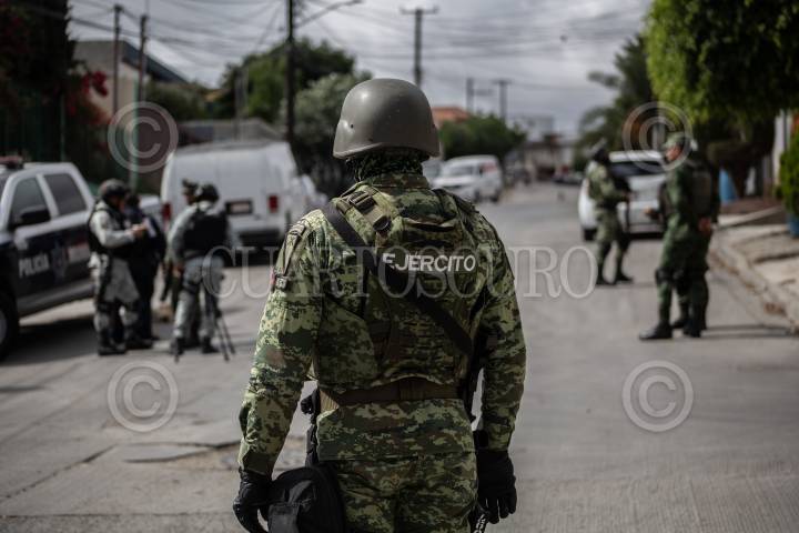 TIJUANA, BAJA CALIFORNIA, 11OCTUBRE2023.- Un agente del Ejercito Mexicano reguardando la escena. El cuerpo sin vida envuelto en una sabana color café y cartón, atado con un cable, fue encontrado en la colonia Emperadores. De acuerdo a información extraoficial, un taxista que transitaba por la calle Chacatzil cuando observó un bulto sospechoso y notifico a unos agentes de la Guardia Nacional que se encontraban cerca del lugar. Al llegar autoridades dieron positivo al hallazgo, quedando a cargo elementos de la Fiscalia General del Estado y Servicios Periciales, quienes procesaron la escena. FOTO: OMAR MARTÍNEZ/ CUARTOSCURO.COM