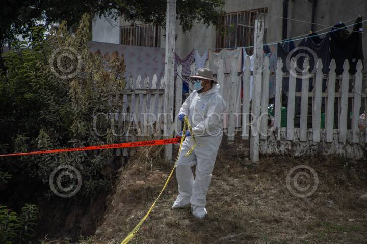 TIJUANA, BAJA CALIFORNIA, 11OCTUBRE2023.- Un agente de Servicios Periciales con una cinta de ''precaución''. El cuerpo sin vida envuelto en una sabana color café y cartón, atado con un cable, fue encontrado en la colonia Emperadores. De acuerdo a información extraoficial, un taxista que transitaba por la calle Chacatzil cuando observó un bulto sospechoso y notifico a unos agentes de la Guardia Nacional que se encontraban cerca del lugar. Al llegar autoridades dieron positivo al hallazgo, quedando a cargo elementos de la Fiscalia General del Estado y Servicios Periciales, quienes procesaron la escena. FOTO: OMAR MARTÍNEZ/ CUARTOSCURO.COM