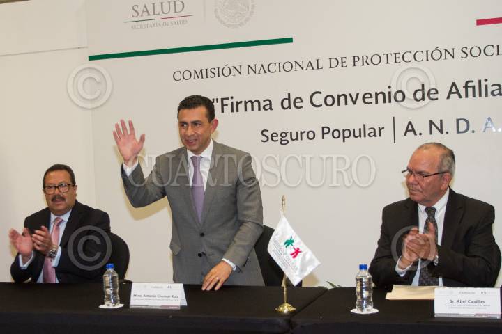 CIUDAD DE MÉXICO, 08MARZO2018.- Antonio Chemor Ruiz, titular de la Comisión Nacional de Protección Social en Salud, firmó un convenio de colaboración con Abel Casillas, secretario sustituto provisional de la ANDA, para que sus agremiados tengan acceso al Seguro Popular. FOTO: ISAAC ESQUIVEL /CUARTOSCURO.COM