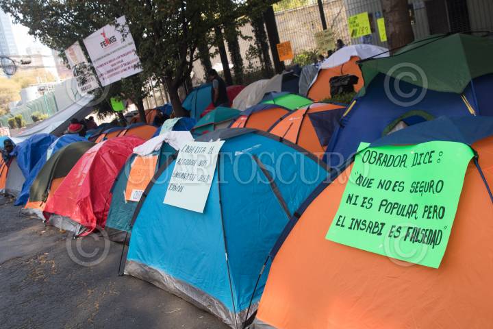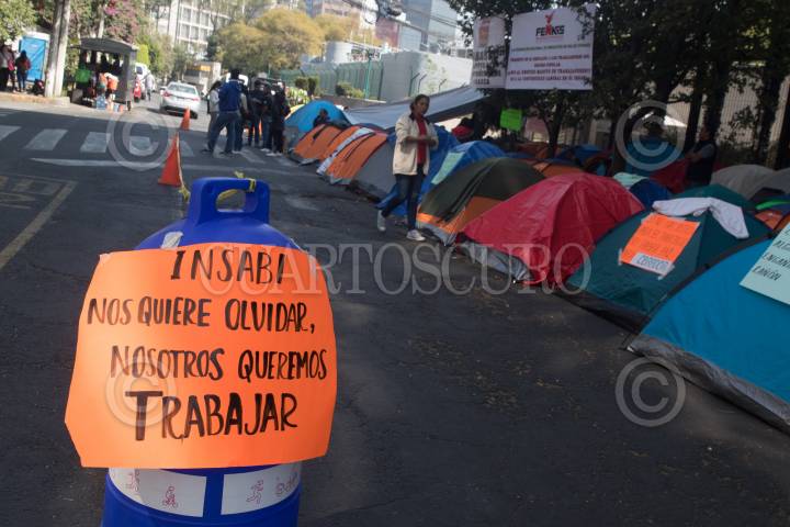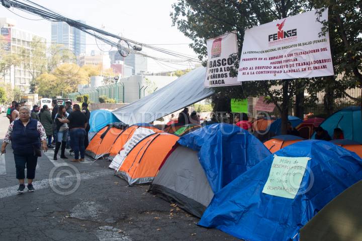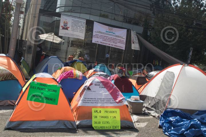 Trabajadores que perdieron su empleo tras la desaparición del Seguro Popular mantienen un plantón en la sede del Instituto Nacional de Salud y Bienestar (Insabi)