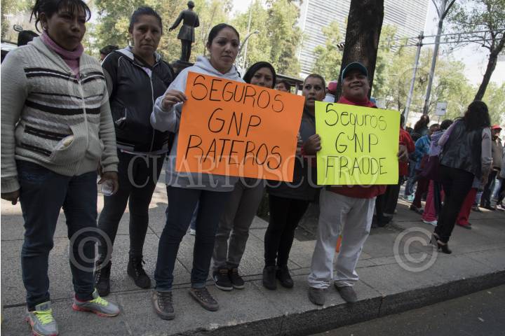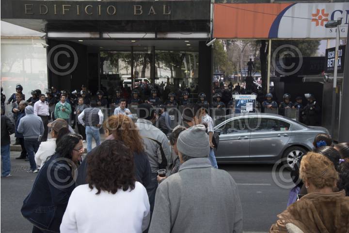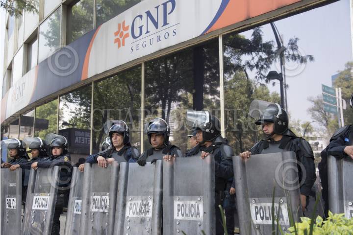 CIUDAD DE MÉXICO, 08MARZO2017.- Miembros del Barzón Popular y de Fopovi, realizaron una manifestación a las afueras del edificio de los Seguros GNP ubicado en Paseo de la Reforma, debido a que no cumplen con lo establecido en sus contratos. Debido a esto, decenas de granaderos fueron colocados en la banqueta para proteger las instalaciones. FOTO: TERCERO DÍAZ /CUARTOSCURO.COM