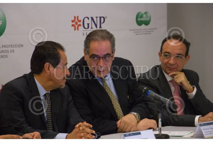 CIUDAD DE MÉXICO, 20MAYO2019.- Oscar Rosado Jimenénez, Presidente de la CONDUSEF; Roberto Tejero Castañeda, Vicepresidente de delegaciones de la CONDUSEF y Manuel Básica Álvarez; Director de Recursos Humanos de GNP seguros durante el lanzamiento del programa, "Jóvenes Trabajando", el cual es impulsado por el convenio entre la CONDUSEF y GNP Seguros y tiene como objetivo incentivar a jóvenes que realizan sus pasantías dentro de la institución y con la posibilidad de quedarse a trabajar al termino de sus estudios. FOTO: ROGELIO MORALES /CUARTOSCURO.COM