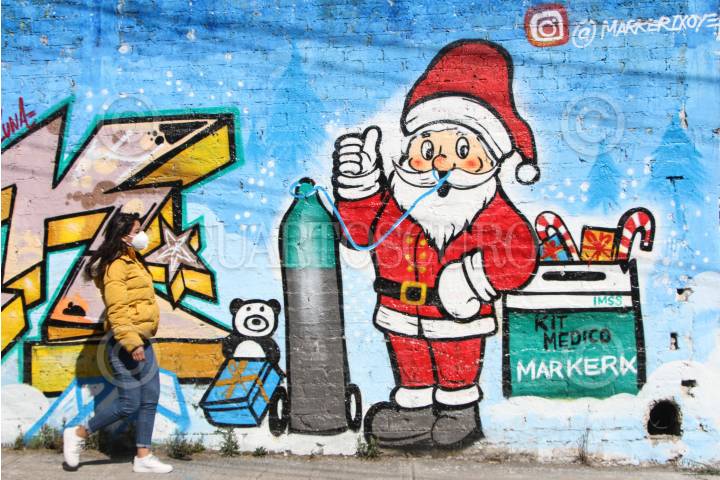 Mujer camina frente a mural de Santa Claus con tanque de oxígeno.