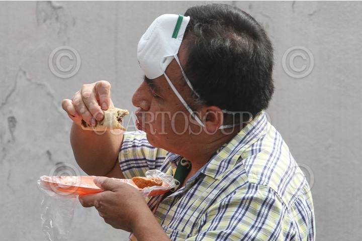 Hombre se coloca el cubrebocas en la frente mientras come tacos a las afueras del Hospital Regional N2.