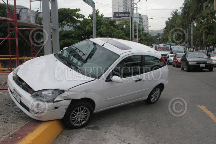 ACAPULCO, GUERRERO, 28AGOSTO2009.- Un aparatoso accidente en la avenida Costera esquina con la Via Rápida un vehículo tipo sedan se impacto contra unos postes de semáforos que estaban siendo reparados por trabajadores de la Secretaria de Transito Municipal donde estuvieron a punto de ser arroyados por el conductor que iba en estado de ebriedad. FOTO: BERNANDINO HERNANDEZ/CUARTOSCURO.COM