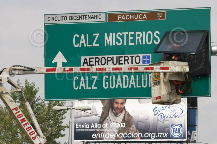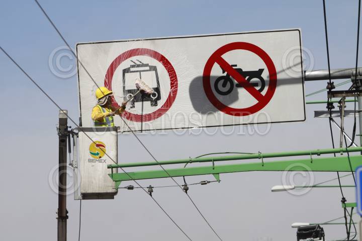 MÉXICO, D.F., 04ENERO2010.- Un trabajador de la empresa SEMEX arregla un letrero vial sobre la avenida Circuito Interior. FOTO: SAÚL LÓPEZ/CUARTOSCURO.COM
