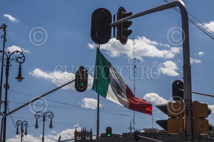 MÉXICO, D.F., 04FEBRERO2015.- La bandera monumental se aprecia en entre las lamparas, semáforos y cablerio en el Zócalo capitalino. FOTO: MOISÉS PABLO /CUARTOSCURO.COM