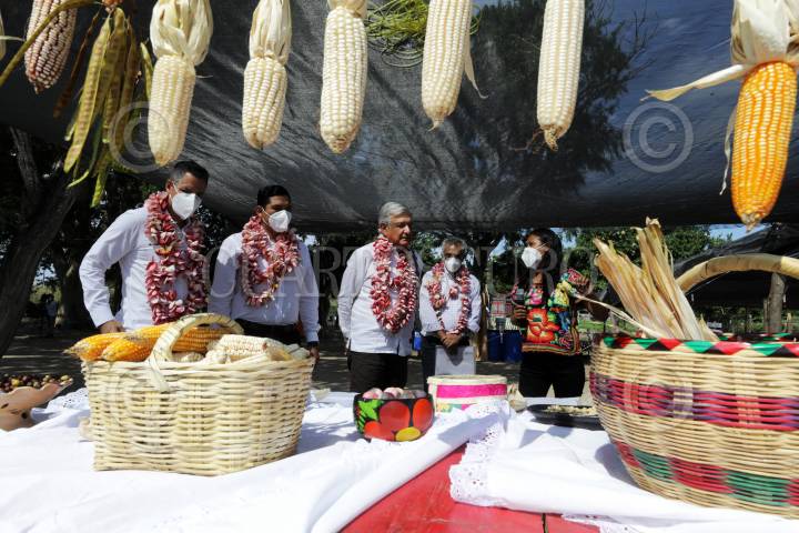 CHILPANCINGO, GUERRERO17ABRIL2007- Aspecto de la reunion que sostuvieron integrantes de la Asamblea Popular de los Pueblos de Guerrero (APPG) con el secretario de desarrollo rural (SEDER) Armando Rios Piter en las instalaciones de la dependencia en donde exigieron la entrega del fertilizante. En la imagen un campesino muestra la cosecha obtenida al sembrar utilizando el llamado "Bio-Fertilizante" que les pretende entregar el gobierno estatal y el que ellos no aceptan y el cual se encuentra en el interior de la dependencia estatal como una muestra para convencer a los campesinos. FOTO OSCAR ALVARADO/CUARTOSCURO.COM