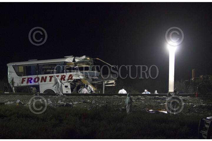 ANÁHUAC, NUEVO LEÓN, 13FEBRERO2015.- Un autobús de pasajeros de transportes Frontera proveniente de Nuevo Laredo, Tamaulipas con dirección a Nueva Rosita, Coahuila, se impactó con un tren de carga de la empresa Kansas Citi Southern México en la Carretera Anáhuac-Nuevo Laredo dejando un saldo de al menos 19 personas fallecidas y una más de una veintena de heridos. Al lugar arribaron protección civil, elementos de la SEDENA, Ministeriales y personal de la SEMEFO. FOTO: GABRIELA PÉREZ MONTIEL / CUARTOSCURO.COM