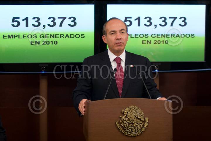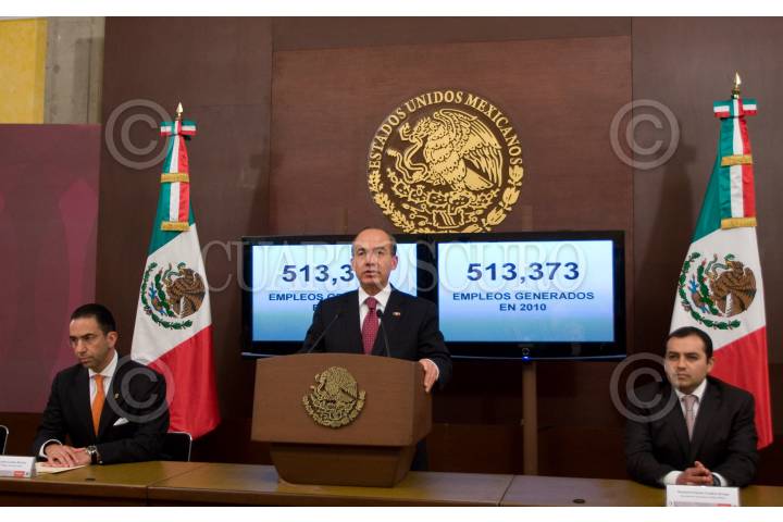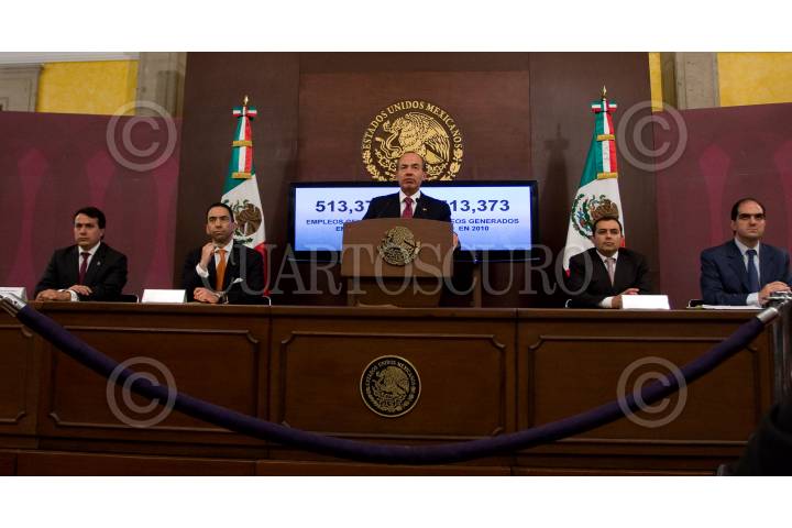 MÉXICO D.F. 01JUIO2010.- Felipe Calderón Hinojosa, Presidente de México, acompañado de Ernesto Cordero Arroyo, Secretario de Hacienda y Crédito Público, Javier Lozano Alarcón, titular de la Secretaria del Trabajo, Gerardo Ruiz Mateos, Secretario de Economía y Daniel Karam Touhmet, Directos del IMSS, dio a conocer la creación de 513373 empleos formales los cuales fueron generados durante el primer semestre de este año, esto en la residencia oficial de los Pinos. FOTO: GUILLERMO PEREA/CUARTOSCURO.COM