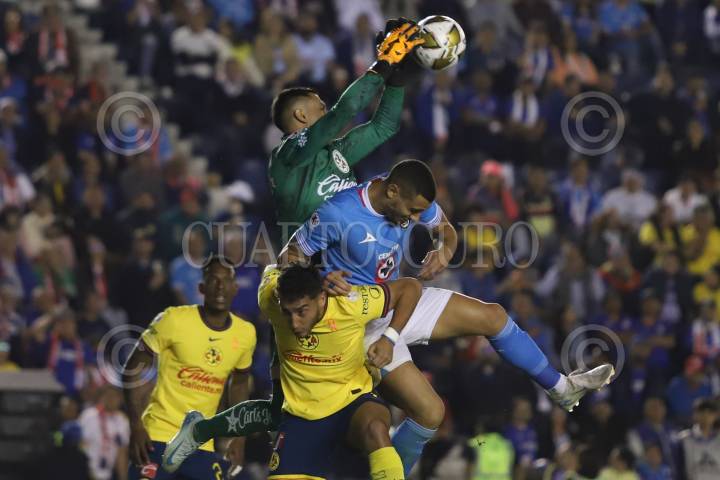 CIUDAD DE MÉXICO, 08DICIEMBRE2024.- Luis Malagón, portero del América, sale por el balón en una jugada dentro del área. FOTO: DANIEL AUGUSTO/ CUARTOSCURO.COM