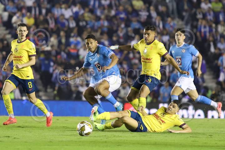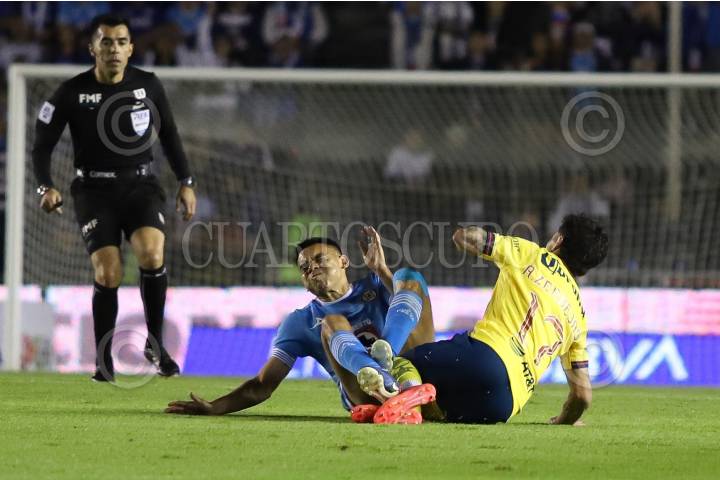 CIUDAD DE MÉXICO, 08DICIEMBRE2024.- Ignacio Rivero, jugador de Cruz Azul, se queja de un golpe por parte de un americanista. FOTO: DANIEL AUGUSTO/ CUARTOSCURO.COM