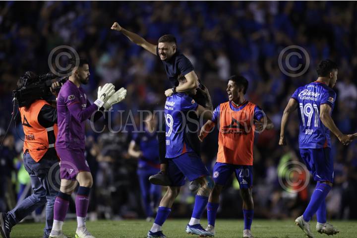 CIUDAD DE MÉXICO, 08DICIEMBRE2024.- Amaury Montaño, jugador de Cruz Azul, celebra el gol con el que puso el empate a tres de manera momentánea. FOTO: DANIEL AUGUSTO/ CUARTOSCURO.COM