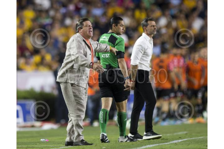 Miguel Herrera, Director Técnico de los Tigres de la UANL, da indicaciones a los jugadores, durante el partido contra el Atlas correspondiente a la vuelta en semifinales en el estadio Universitario.