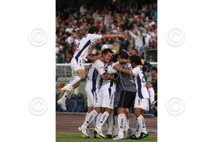 MÉXICO, D.F., 16MAYO2009.- Jugadores de los pumas de la UNAM festejan la tercera anotación en contra de los Tecos de la UAG en partido de cuartos de final del Clausura 2009 del futbol mexicano; venciendo los Pumas 3 goles a 0 y pasando estos a las semifinales. FOTO: LUZ ACEVEDO/CUARTOSCURO.COM