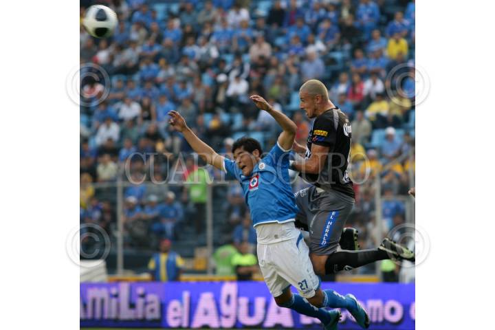 MÉXICO, D.F., 20NOVIEMBRE2010.- Cesar Villaluz de la Maquina Celeste del Cruz Azul pelea el balón durante el partido de vuelta en contra de los Pumas de la UNAM que se realizo en el Estadio Azul; partido de cuartos de final que ganó Pumas 2 goles por 0 pasando así a semifinales. FOTO: RODOLFO ANGULO/CUARTOSCURO.COM