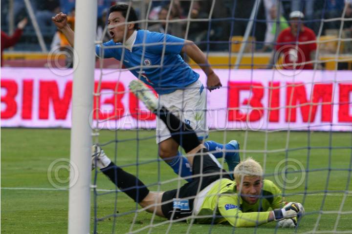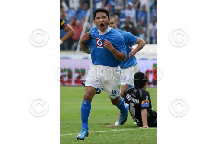 MÉXICO, D.F., 28NOVIEMBRE2009.- Cesar Villaluz de la Maquina Celeste del Cruz Azul festeja su anotación en contra del Puebla de la Franja en donde la Maquina gano 3 goles a 2 en el partido de cuartos de final del torneo Apertura 2009 que se celebro en el estadio Azul y pasando la Maquina a las semifinales. FOTO: RODOLFO ANGULO/CUARTOSCURO.COM