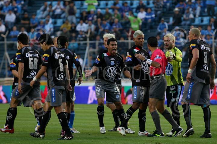 MÉXICO, D.F., 28NOVIEMBRE2009.- Jugadores del Puebla de la Franja reclaman al arbitro durante el encuentro en contra de Maquina Celeste del Cruz Azul en donde la Maquina gano 3 goles a 2 en el partido de cuartos de final del torneo Apertura 2009 que se celebro en el estadio Azul y pasando la Maquina a las semifinales. FOTO: RODOLFO ANGULO/CUARTOSCURO.COM