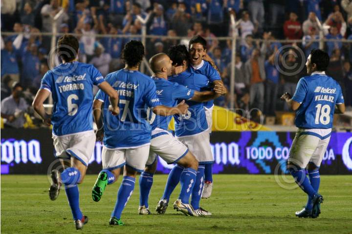 MÉXICO, D.F., 28NOVIEMBRE2009.- Julio Cesar Dominguez de la Maquina Celeste del Cruz Azul festeja su anotación en contra del Puebla de la Franja en donde la Maquina gano 3 goles a 2 en el partido de cuartos de final del torneo Apertura 2009 que se celebro en el estadio Azul y pasando la Maquina a las semifinales. FOTO: RODOLFO ANGULO/CUARTOSCURO.COM