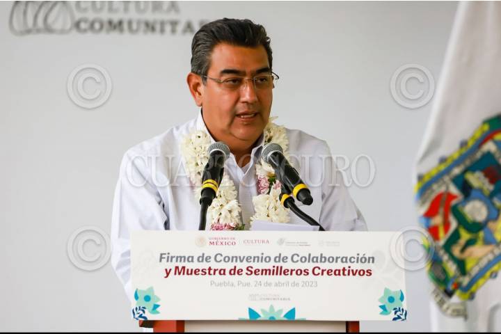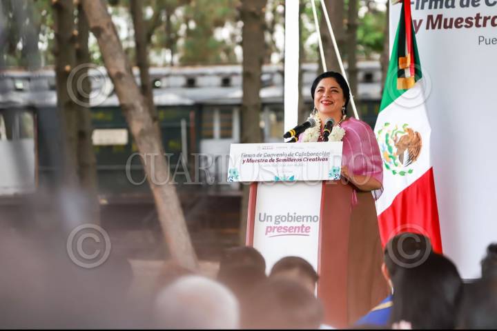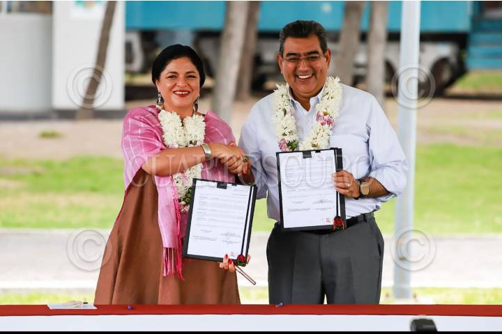 Alejandra Frausto, secretaria de Cultura, y Sergio Salomón Céspedes, gobernador de Puebla, encabezaron la firma de Convenio de Colaboración y Muestra de Semilleros Creativos, en el Museo Nacional de los Ferrocarrileros Mexicanos.