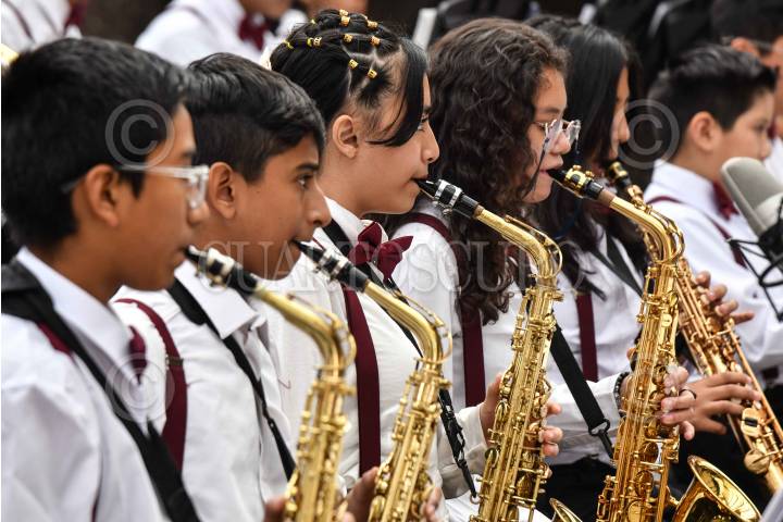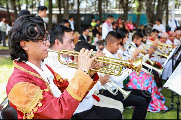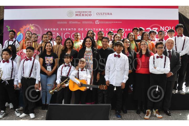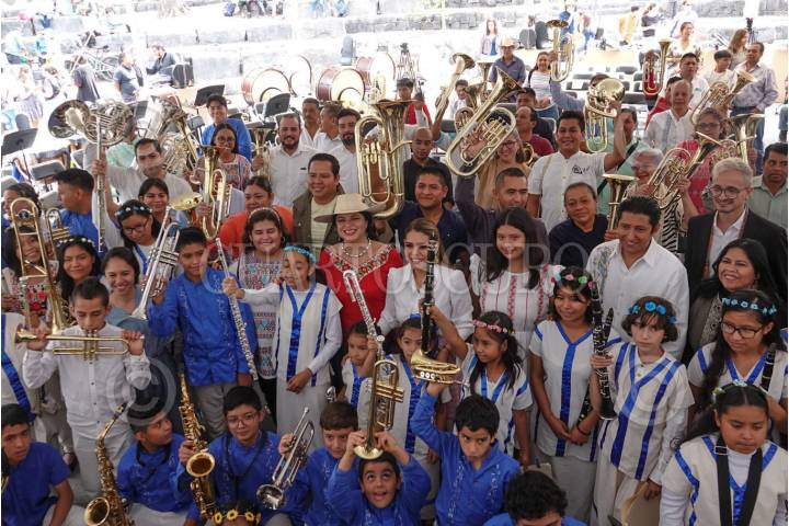 Alejandra Frausto Guerrero, secretaria de Cultura; Evelyn Salgado Pineda, gobernadora de Guerrero; Esther Hernández Torres, directora general de Vinculación Cultural, y Roberto Rentería Yrene, titular del Sistema Nacional de Fomento Musical, encabezaron la entrega de instrumentos musicales a los estados de Guerrero y Morelos; así como al Encuentro de Semilleros Creativos, donde niñas, niños y jóvenes de estos estados tocaron melodías durante el evento en el Centro de Cultura Ambiental, ubicado en el Bosque de Chapultepec