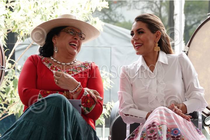 Alejandra Frausto Guerrero, secretaria de Cultura, y Evelyn Salgado, gobernadora de Guerrero, conversaron durante la entrega de instrumentos musicales a los estados de Guerrero y Morelos en el Centro de Cultura Ambiental, ubicado en el Bosque de Chapultepec