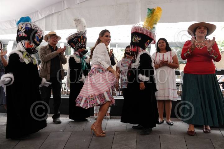 Alejandra Frausto Guerrero, secretaria de Cultura, y Evelyn Salgado, gobernadora de Guerrero, bailarín con chinelos durante la entrega de instrumentos musicales a los estados de Guerrero y Morelos en el Centro de Cultura Ambiental, ubicado en el Bosque de Chapultepec