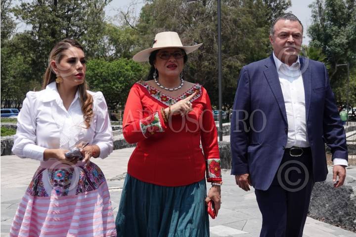 Alejandra Frausto Guerrero, secretaria de Cultura; Evelyn Salgado Pineda, gobernadora de Guerrero, y Roberto Rentería Yrene, titular del Sistema Nacional de Fomento Musical, durante llegada a la entrega de instrumentos musicales en el Centro de Cultura Ambiental, ubicado en el Bosque de Chapultepec