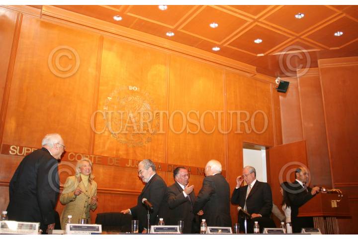 MÉXICO, D.F. 24ENERO2005.- El academico Héctor Fix Zamudio, la magistrada Olga Sánchez, el presidente de la comision interamericana de derechos humanos Sergio García Ramírez, el presidente de la suprema corte de justicia de la nación, Mariano Azuela, el relator especial de la ONU, Rodolfo Stavenhagen y el ministro Juan Silva al termino de la inaguración del seminario de derechos humanos en la SCJN. FOTO: Miguel Dimayuga/CUARTOSCURO.COM