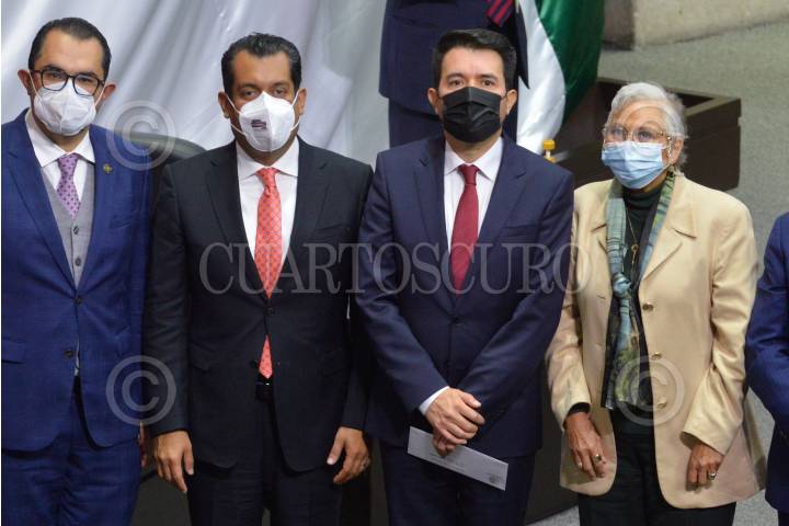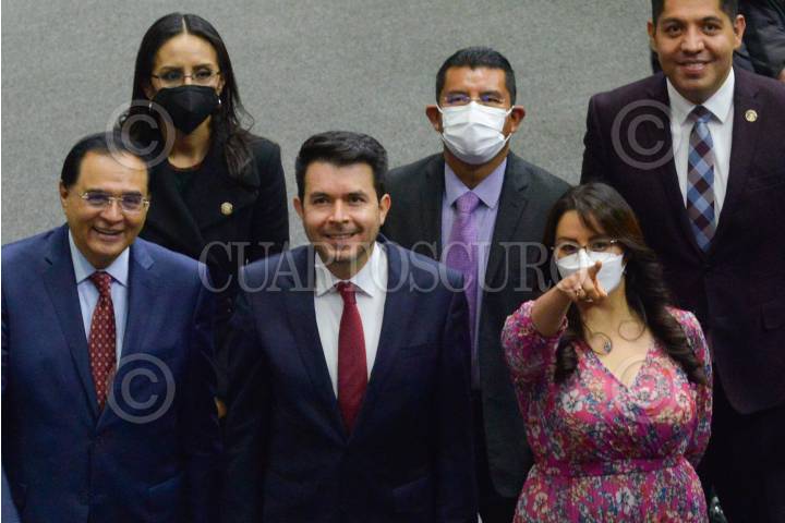 Los diputados de Morena: Otoniel García; Joaquín Zebadúa; Félix Durán; Esteban del Razo y Manuel Robles, mostraron mantas en contra de Genaro García Luna, ex secretario de Seguridad Pública y recientemente declarado culpable por presuntos vínculos con el narcotráfico.