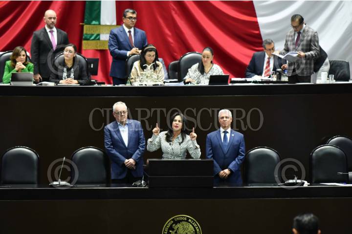 Durante la intervención de María del Rosario Reyes Silva, diputada de Morena, y compañeros de bancada, mostraron mantas en contra de Genaro García Luna, ex secretario de Seguridad Pública y recientemente declarado culpable por presuntos vínculos con el narcotráfico, así como de Felipe Calderón, ex presidente de México.