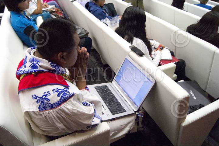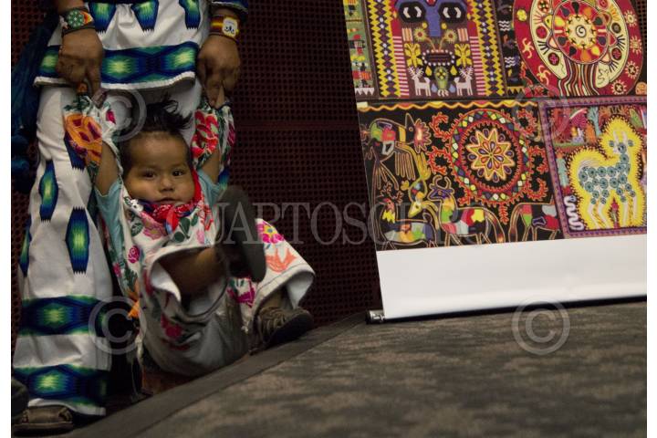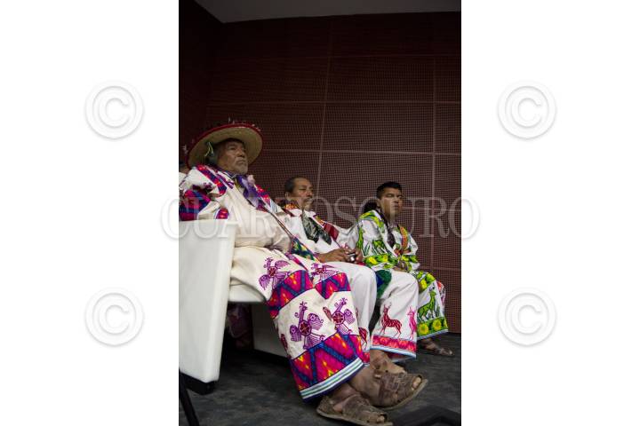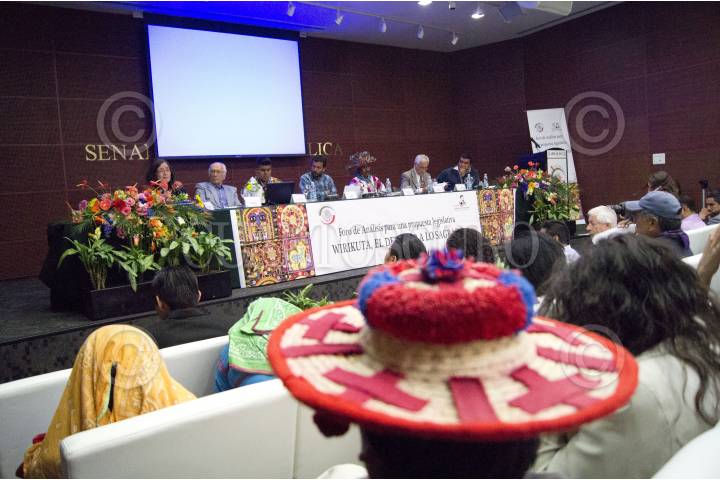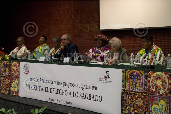 MÉXICO, D.F., 18ABRIL2012.- Decenas de Huicholes e integrantes del Frente en defensa de Wirikuta, acudieron al Senado de la República con motivo del Foro "Wirikuta, el derecho a lo sagrado", en el cuál se realizó un analisis sobre la minera canadiense que pretende explotar el territorio sagrado huichol en San luis Potosí, y lo que esto implica. En el foro participaron la escritora Elena Poniatowska, el senador Pablo Gómez, la reconocida antropóloga Magdalena Gómez, el doctor Rodolfo Stavenhaguen, así cmo tamnién autoridades del pueblo Wixaritari (huichol). El día de mañana se llevará a cabo la segunda mitad de este foro. FOTO: PEDRO ANZA /CUARTOSCURO.COM