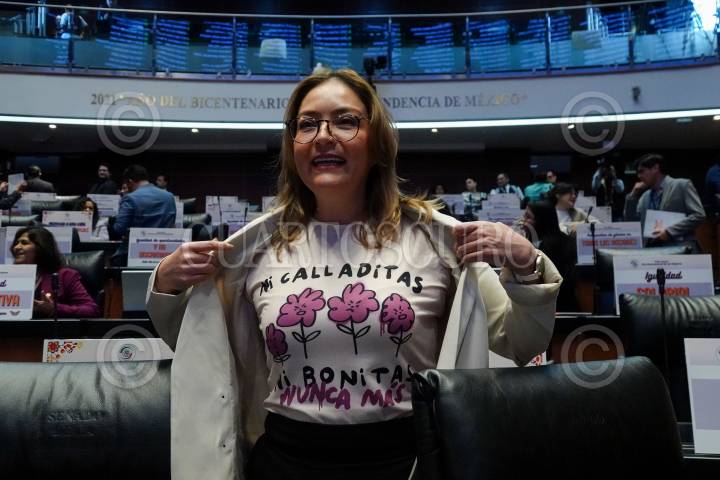 CIUDAD DE MÉXICO, 05MARZO2025.- La senadora morenista Veronica Del Carmen Diaz muestra su playera con la leyenda “Ni calladitas Ni bonitas Nunca Más” durante la sesión ordinaria en que se conmemoró el Día Internacional de la Mujer (8 de marzo). FOTO: GALO CAÑAS/CUARTOSCURO.COM