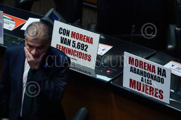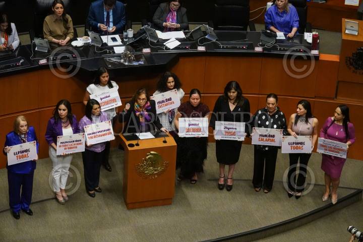 CIUDAD DE MÉXICO, 05MARZO2025.- Senadores de oposición colocaron pancartas con las leyendas “Con Morena van 5692 Feminicidios” y “Morena ha abandona a las Mujeres” durante la sesión ordinaria en que se conmemoró el Día Internacional de la Mujer (8 de marzo). FOTO: GALO CAÑAS/CUARTOSCURO.COM