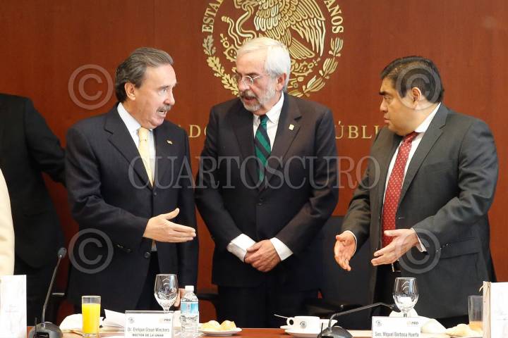 CIUDAD DE MÉXICO, 10MARZO2016.- Enrique Graue Wiechers, rector de la Universidad Nacional Autónoma de México (UNAM), se reunión esta tarde con senadores del grupo parlamentario del Partido de la Revolución Democrática (PRD) y el senador del PRI, Emilio Gamboa Patrón. FOTO: CUARTOSCURO.COM