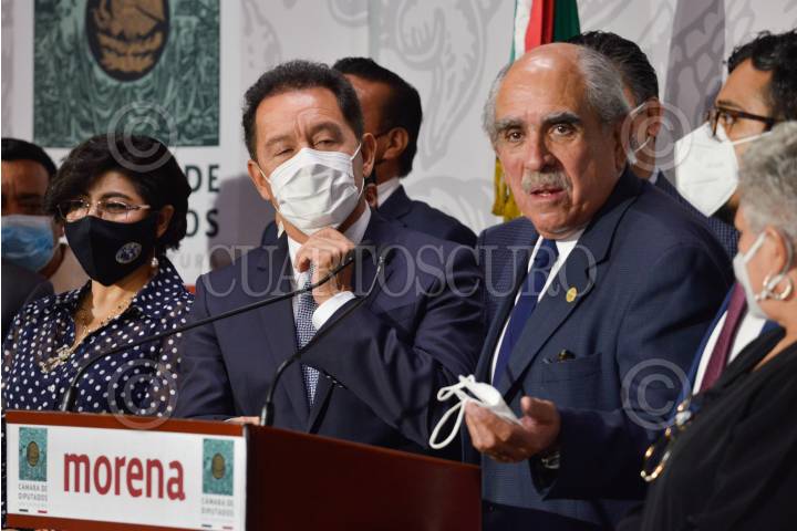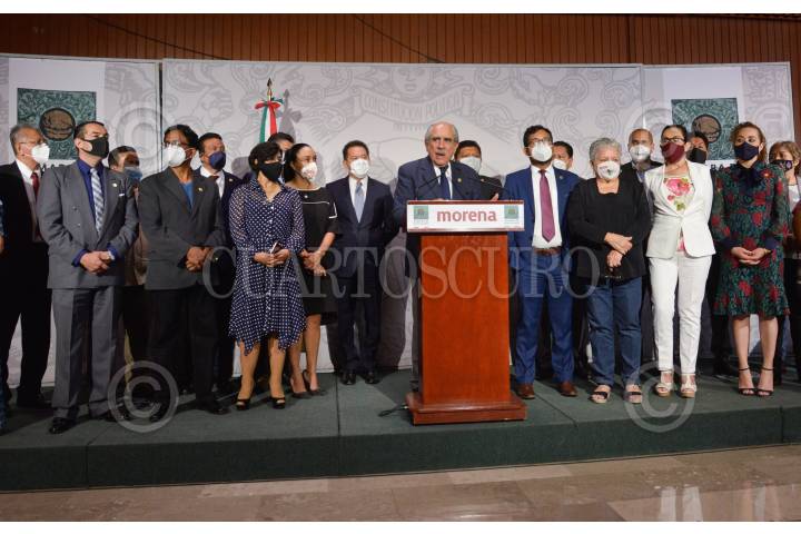 Ignacio Mier, diputado y coordinador de Morena, Pablo Gómez, e integrantes del mismo grupo parlamentario, ofrecieron conferencia de prensa para informar la separación de Saúl Huerta Corona, del grupo parlamentario de Morena.