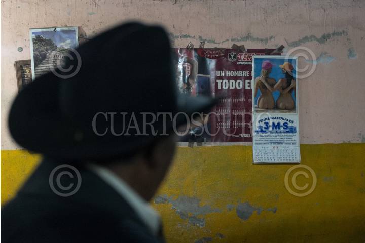 CHERÁN, MICHOACAN, 16ABRIL2018.- Hombre de tercera edad mira pósters de mujeres mientras juega billar. FOTO: ANDREA MURCIA /CUARTOSCURO.COM