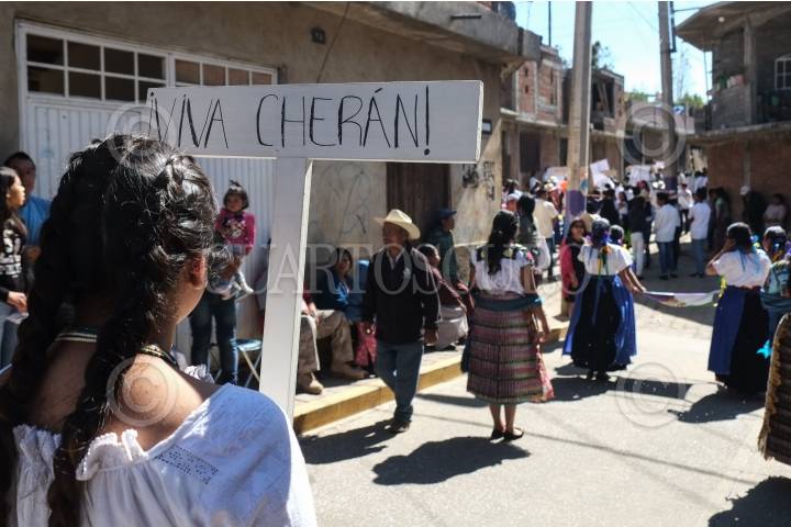 CHERÁN, MICHOACAN, 16ABRIL2018.- Niña porta cartulina con la frase “viva Cherán” mientras camina por el pueblo. FOTO: ANDREA MURCIA /CUARTOSCURO.COM