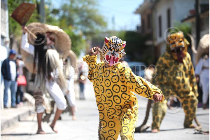 Tecuanes de Linceres de la comunidad de Santiago Tuxtla Veracruz durante participación en el Séptimo Encuentro de Tecuanes realizado este día en Tetelpa, Morelos.