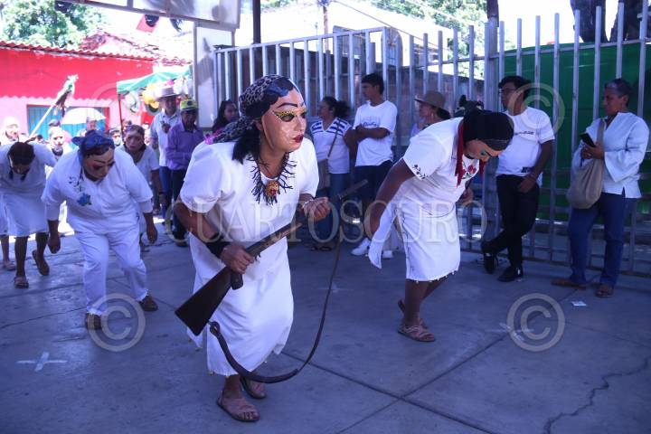 Comparsa de mujeres tecuanes de Ocotepec Morelos durante participación en el Séptimo Encuentro de Tecuanes realizado este día en Tetelpa, Morelos.