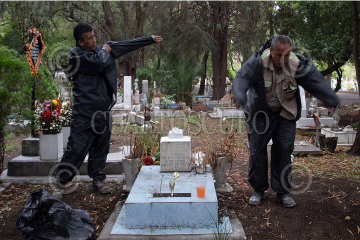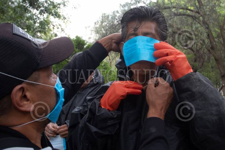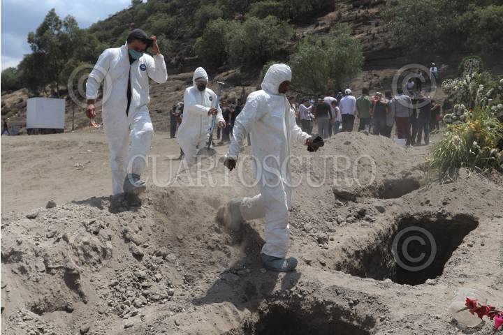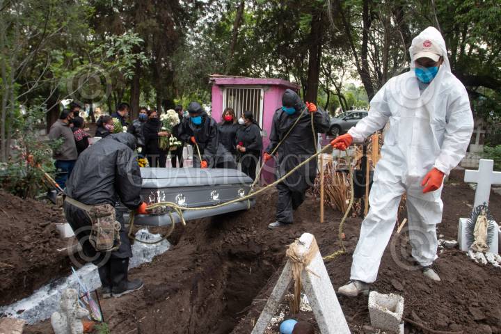 Sepultureros utilizaron traje protector, guantes y cubrebocas precio a una inhumación por muerte a causa de Covid-19 en el Panteón Civil San Nicolás Tolentino
