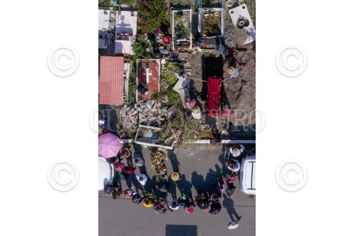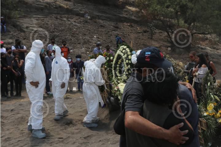 Panorámica aérea del panteón civil "Xico" del Valle de Chalco, en el que se han ocupado más de 400 fosas, que significa aproximadamente entre 20 y 25 por ciento de su totalidad. En la imagen, familiares durante un sepelio de un probable caso covid-19.